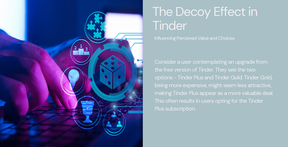 Social Proofing is implemented through Tinder's "Top Picks" and "Most Swiped Right" users, encouraging others to swipe right based on crowd behavior. The Decoy Effect, on the other hand, is used in Tinder's pricing strategy. Tinder Gold, priced just a little higher than Tinder Plus, but offering significantly more features, acts as a decoy to nudge users towards the Gold subscription.